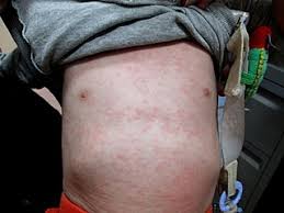 痒みを伴う、紙やすりのようなザラザラした細かい赤い発疹が、首、胸、お腹、背中などに出ることがあります。