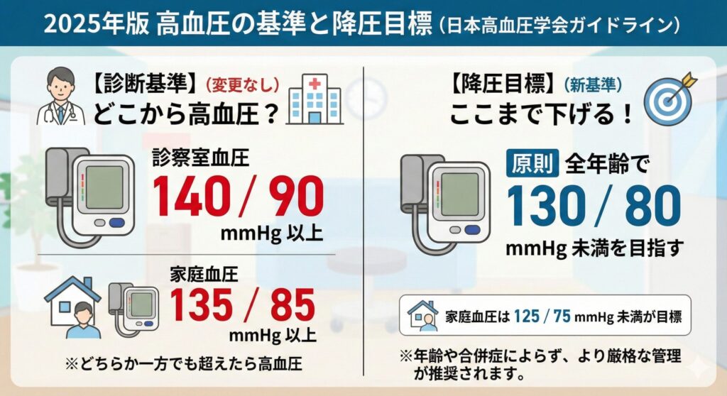 日本高血圧学会の最新ガイドライン(2025年版)では、以下の数値を「高血圧」と定義しています。
